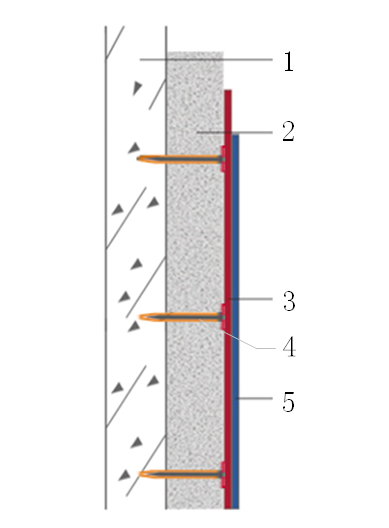 1—基层墙体;2—JKS保温浇筑料;3—抗裂砂浆复合耐碱网格布;4—锚固件;5—饰面层