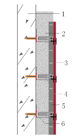 1—基层墙体;2—JKS保温浇筑料;3—饰面板;4—六角螺丝和尼龙垫片;5—龙骨卡件;6—锚固件